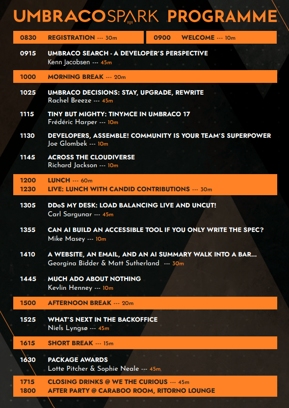 Umbraco Spark focuses on technical, innovation and developer-focused topics and is dedicated to bringing together developers for a day of learning and inspiration.